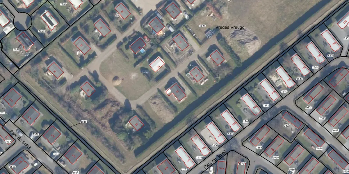 Het perceel waarop Vredes Vreugd 25 staat heeft een oppervlakte van 1,6 ha. Dit is een zeer groot perceel. De perceeloppervlakte wordt geregistreerd door het Kadaster. Gedetailleerde informatie over de maten van dit perceel kunt u vinden in het rapport Kadastrale kaart met maatvoering van Vredes Vreugd 25.