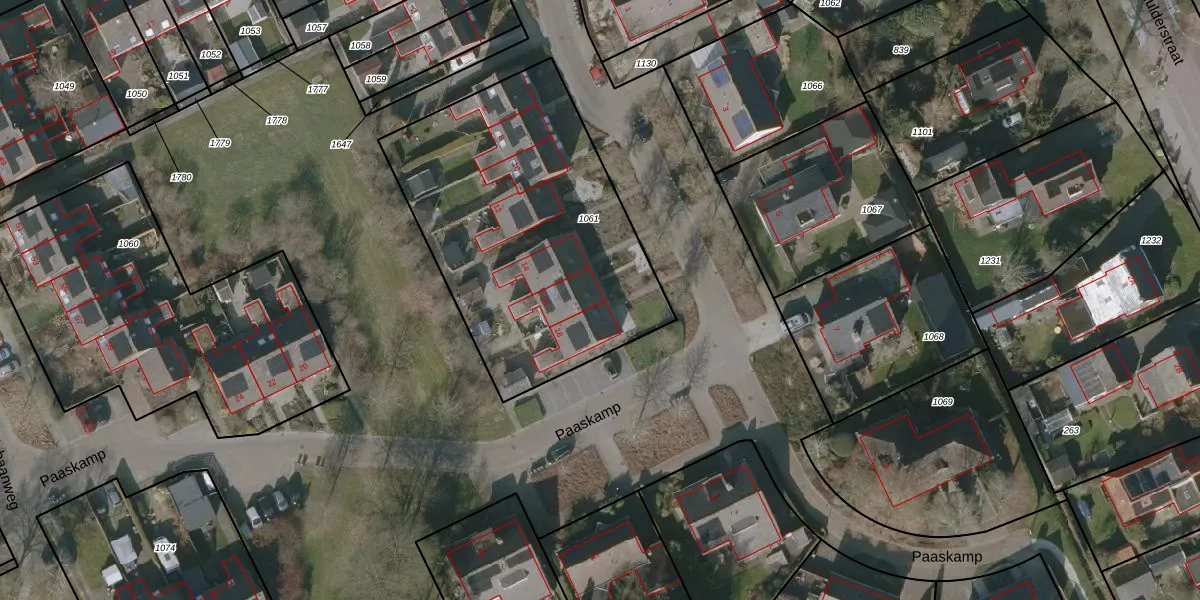Het perceel waarop Paaskamp 16 staat heeft een oppervlakte van 1554 m². Dit is een zeer groot perceel. De perceeloppervlakte wordt geregistreerd door het Kadaster. Gedetailleerde informatie over de maten van dit perceel kunt u vinden in het rapport Kadastrale kaart met maatvoering van Paaskamp 16.
