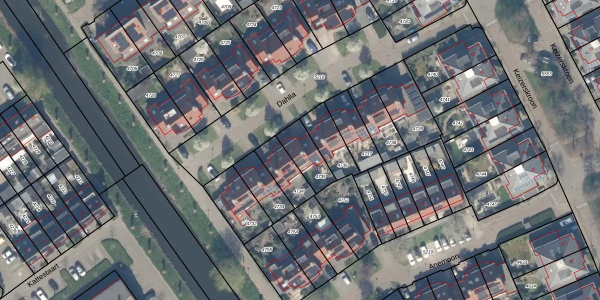 Het perceel waarop Dahlia 8 staat heeft een oppervlakte van 214 m². Dit is een middelgroot perceel. De perceeloppervlakte wordt geregistreerd door het Kadaster. Gedetailleerde informatie over de maten van dit perceel kunt u vinden in het rapport Kadastrale kaart met maatvoering van Dahlia 8.