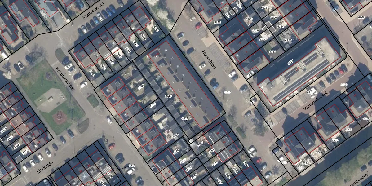 Het perceel waarop Hoornblad 24 staat heeft een oppervlakte van 1266 m². Dit is een zeer groot perceel. De perceeloppervlakte wordt geregistreerd door het Kadaster. Gedetailleerde informatie over de maten van dit perceel kunt u vinden in het rapport Kadastrale kaart met maatvoering van Hoornblad 24.