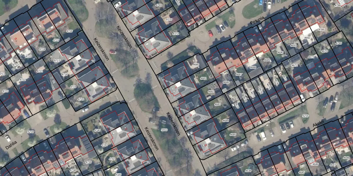 Het perceel waarop Keizerskroon 11 staat heeft een oppervlakte van 261 m². Dit is een middelgroot perceel. De perceeloppervlakte wordt geregistreerd door het Kadaster. Gedetailleerde informatie over de maten van dit perceel kunt u vinden in het rapport Kadastrale kaart met maatvoering van Keizerskroon 11.