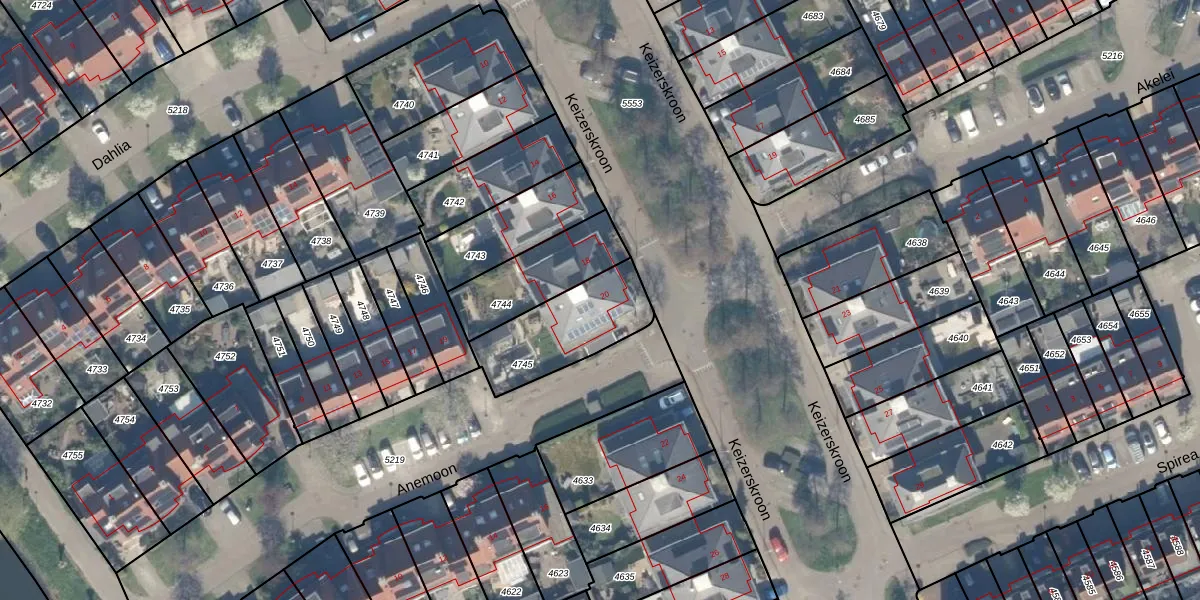 Het perceel waarop Keizerskroon 20 staat heeft een oppervlakte van 335 m². Dit is een groot perceel. De perceeloppervlakte wordt geregistreerd door het Kadaster. Gedetailleerde informatie over de maten van dit perceel kunt u vinden in het rapport Kadastrale kaart met maatvoering van Keizerskroon 20.
