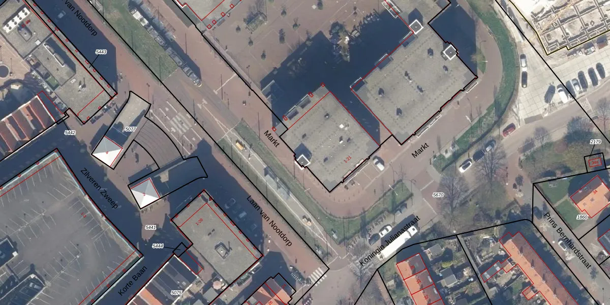 Het perceel waarop Markt 18 staat heeft een oppervlakte van 8385 m². Dit is een zeer groot perceel. De perceeloppervlakte wordt geregistreerd door het Kadaster. Gedetailleerde informatie over de maten van dit perceel kunt u vinden in het rapport Kadastrale kaart met maatvoering van Markt 18.