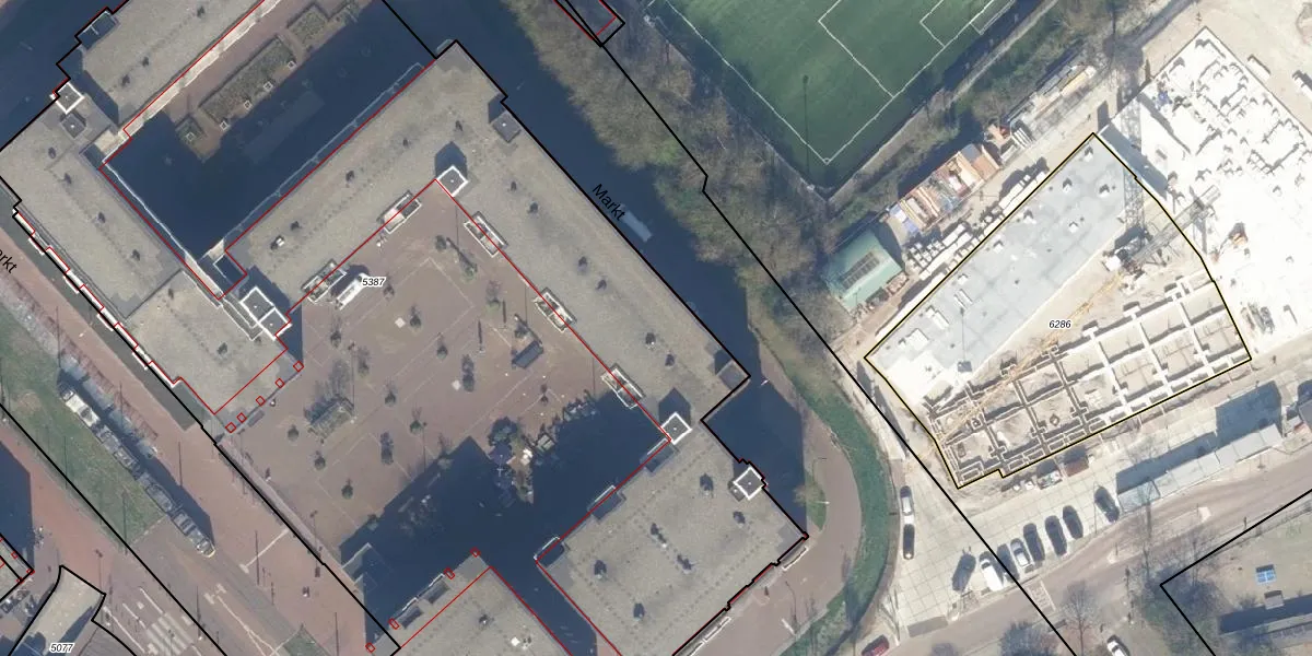 Het perceel waarop Markt 75 staat heeft een oppervlakte van 8385 m². Dit is een zeer groot perceel. De perceeloppervlakte wordt geregistreerd door het Kadaster. Gedetailleerde informatie over de maten van dit perceel kunt u vinden in het rapport Kadastrale kaart met maatvoering van Markt 75.
