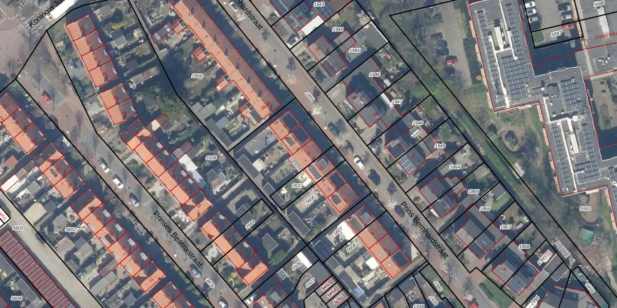 Het perceel waarop Prins Bernhardstraat 15 staat heeft een oppervlakte van 933 m². Dit is een groot perceel. De perceeloppervlakte wordt geregistreerd door het Kadaster. Gedetailleerde informatie over de maten van dit perceel kunt u vinden in het rapport Kadastrale kaart met maatvoering van Prins Bernhardstraat 15.