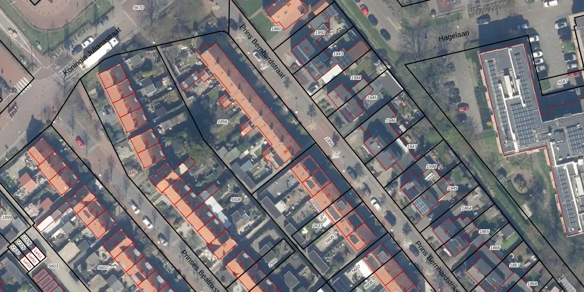 Het perceel waarop Prins Bernhardstraat 25 staat heeft een oppervlakte van 1510 m². Dit is een zeer groot perceel. De perceeloppervlakte wordt geregistreerd door het Kadaster. Gedetailleerde informatie over de maten van dit perceel kunt u vinden in het rapport Kadastrale kaart met maatvoering van Prins Bernhardstraat 25.