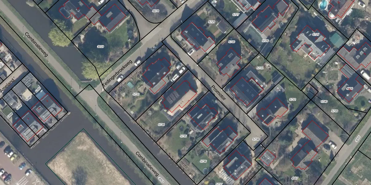 Het perceel waarop Promotor 2 staat heeft een oppervlakte van 642 m². Dit is een groot perceel. De perceeloppervlakte wordt geregistreerd door het Kadaster. Gedetailleerde informatie over de maten van dit perceel kunt u vinden in het rapport Kadastrale kaart met maatvoering van Promotor 2.