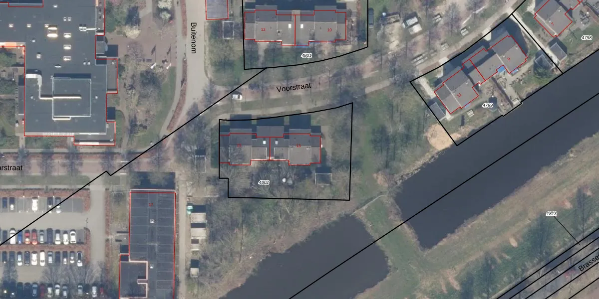 Het perceel waarop Voorstraat 13 staat heeft een oppervlakte van 1214 m². Dit is een zeer groot perceel. De perceeloppervlakte wordt geregistreerd door het Kadaster. Gedetailleerde informatie over de maten van dit perceel kunt u vinden in het rapport Kadastrale kaart met maatvoering van Voorstraat 13.