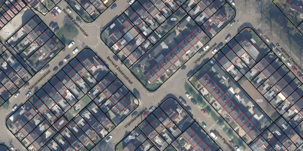 Het perceel waarop Vrijenbansestraat 16 staat heeft een oppervlakte van 1206 m². Dit is een zeer groot perceel. De perceeloppervlakte wordt geregistreerd door het Kadaster. Gedetailleerde informatie over de maten van dit perceel kunt u vinden in het rapport Kadastrale kaart met maatvoering van Vrijenbansestraat 16.