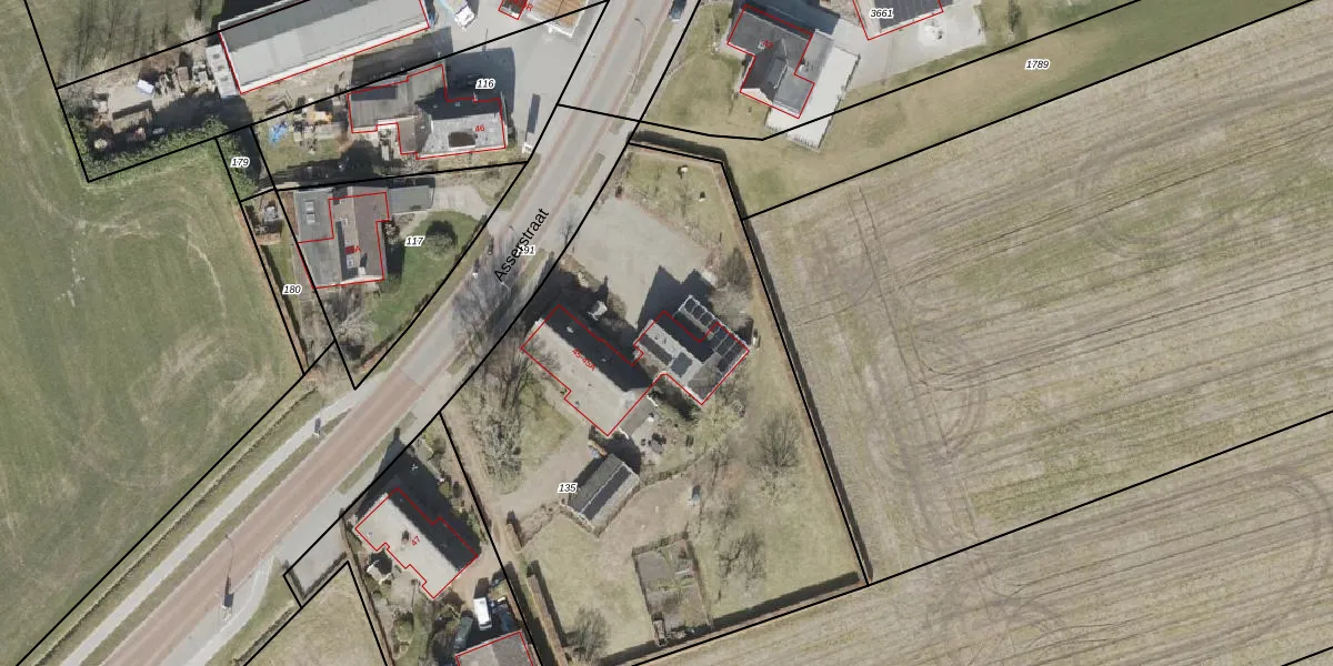 Het perceel waarop Asserstraat 45-A staat heeft een oppervlakte van 3165 m². Dit is een zeer groot perceel. De perceeloppervlakte wordt geregistreerd door het Kadaster. Gedetailleerde informatie over de maten van dit perceel kunt u vinden in het rapport Kadastrale kaart met maatvoering van Asserstraat 45-A.