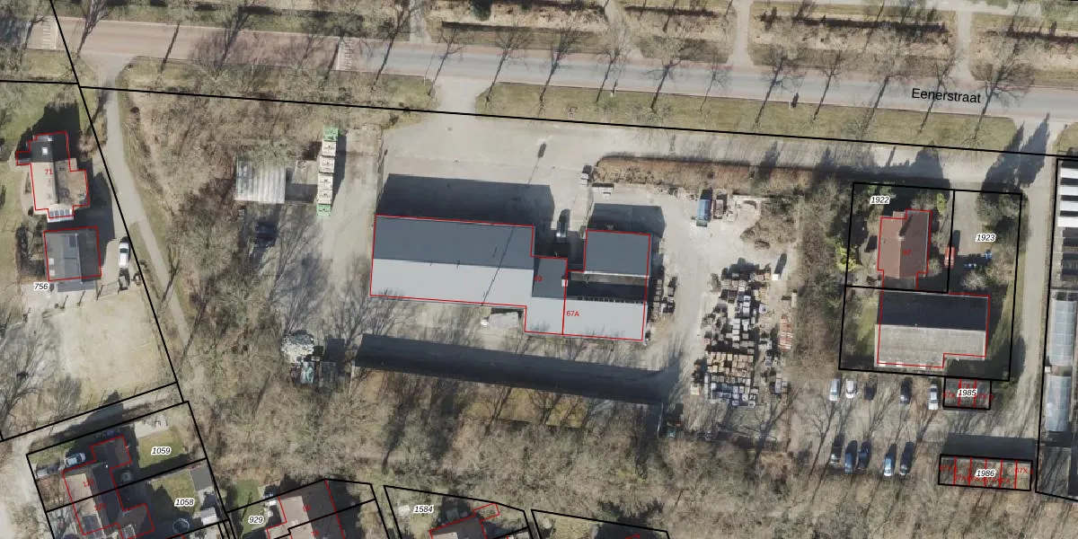 Het perceel waarop Eenerstraat 69 staat heeft een oppervlakte van 5,6 ha. Dit is een zeer groot perceel. De perceeloppervlakte wordt geregistreerd door het Kadaster. Gedetailleerde informatie over de maten van dit perceel kunt u vinden in het rapport Kadastrale kaart met maatvoering van Eenerstraat 69.