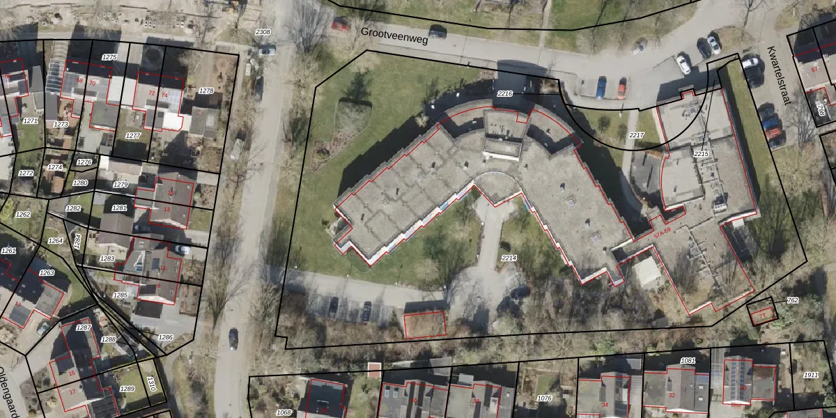 Het perceel waarop Grootveenweg 59-K102 staat heeft een oppervlakte van 6714 m². Dit is een zeer groot perceel. De perceeloppervlakte wordt geregistreerd door het Kadaster. Gedetailleerde informatie over de maten van dit perceel kunt u vinden in het rapport Kadastrale kaart met maatvoering van Grootveenweg 59-K102.