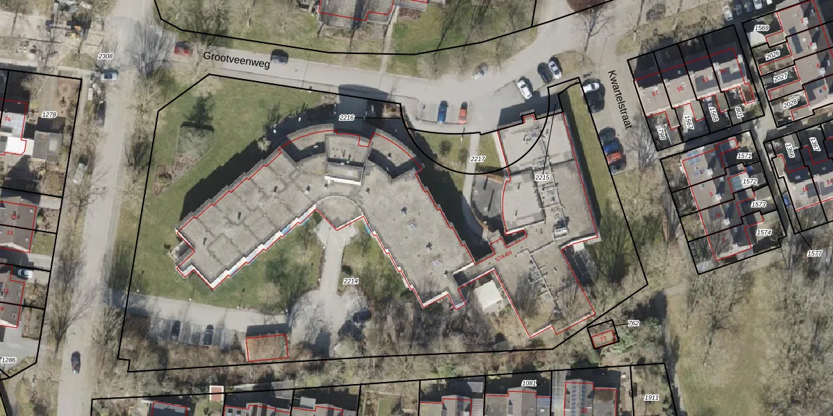 Het perceel waarop Grootveenweg 59-K113 staat heeft een oppervlakte van 6714 m². Dit is een zeer groot perceel. De perceeloppervlakte wordt geregistreerd door het Kadaster. Gedetailleerde informatie over de maten van dit perceel kunt u vinden in het rapport Kadastrale kaart met maatvoering van Grootveenweg 59-K113.