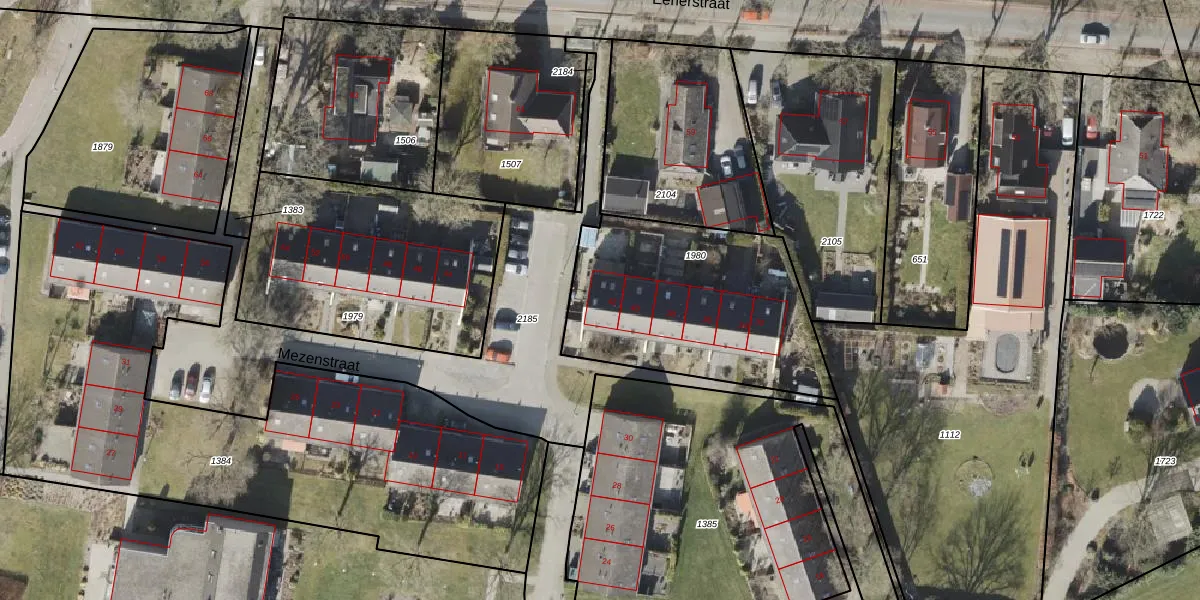 Het perceel waarop Mezenstraat 42 staat heeft een oppervlakte van 985 m². Dit is een groot perceel. De perceeloppervlakte wordt geregistreerd door het Kadaster. Gedetailleerde informatie over de maten van dit perceel kunt u vinden in het rapport Kadastrale kaart met maatvoering van Mezenstraat 42.