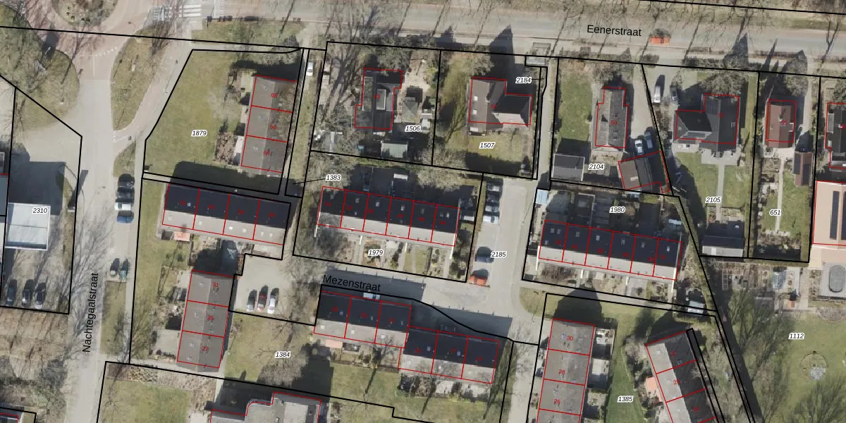 Het perceel waarop Mezenstraat 46 staat heeft een oppervlakte van 1059 m². Dit is een zeer groot perceel. De perceeloppervlakte wordt geregistreerd door het Kadaster. Gedetailleerde informatie over de maten van dit perceel kunt u vinden in het rapport Kadastrale kaart met maatvoering van Mezenstraat 46.