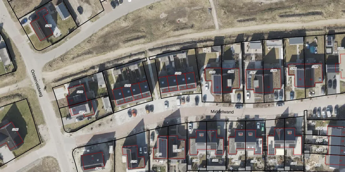 Het perceel waarop Middelwand 12 staat heeft een oppervlakte van 617 m². Dit is een groot perceel. De perceeloppervlakte wordt geregistreerd door het Kadaster. Gedetailleerde informatie over de maten van dit perceel kunt u vinden in het rapport Kadastrale kaart met maatvoering van Middelwand 12.