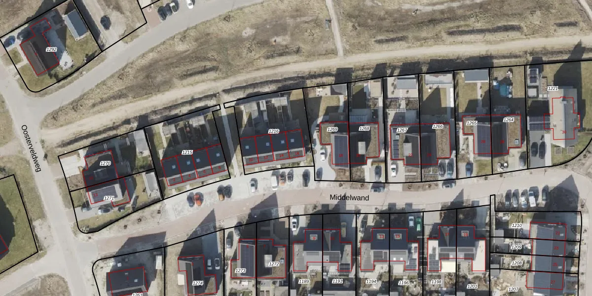 Het perceel waarop Middelwand 16 staat heeft een oppervlakte van 617 m². Dit is een groot perceel. De perceeloppervlakte wordt geregistreerd door het Kadaster. Gedetailleerde informatie over de maten van dit perceel kunt u vinden in het rapport Kadastrale kaart met maatvoering van Middelwand 16.
