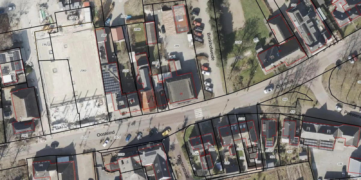 Het perceel waarop Oosteind 25 staat heeft een oppervlakte van 1153 m². Dit is een zeer groot perceel. De perceeloppervlakte wordt geregistreerd door het Kadaster. Gedetailleerde informatie over de maten van dit perceel kunt u vinden in het rapport Kadastrale kaart met maatvoering van Oosteind 25.