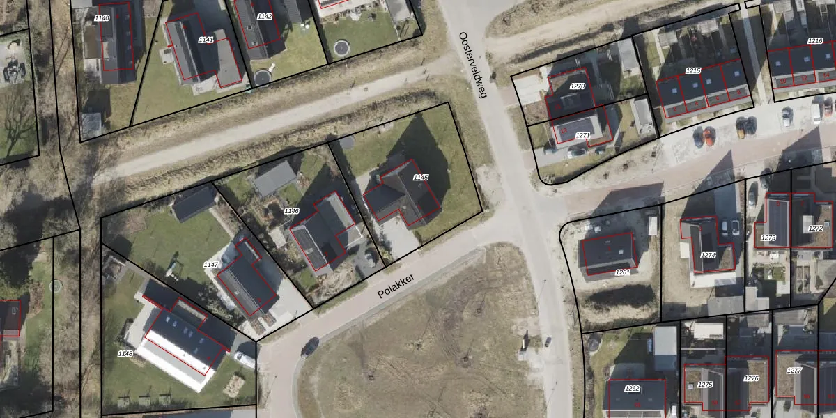 Het perceel waarop Polakker 1 staat heeft een oppervlakte van 857 m². Dit is een groot perceel. De perceeloppervlakte wordt geregistreerd door het Kadaster. Gedetailleerde informatie over de maten van dit perceel kunt u vinden in het rapport Kadastrale kaart met maatvoering van Polakker 1.