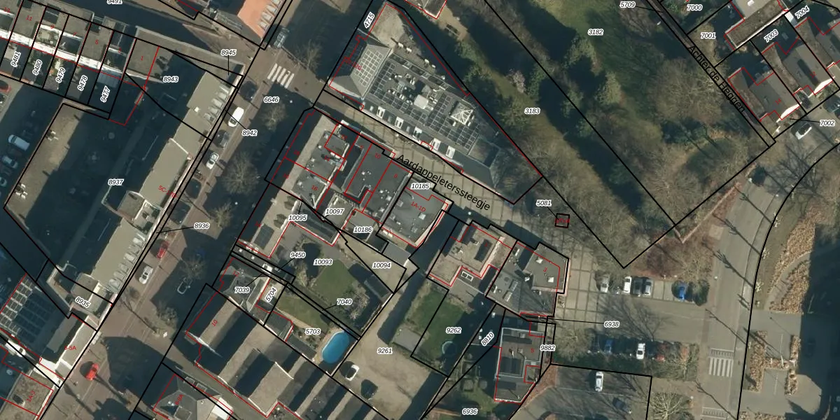 Aardappeleterssteegje 1-B is gelegen op kadastraal perceel NNN00E10185. Deze kadastrale aanduiding is uniek en wordt gebruikt door het Kadaster om eigendomsrechten en andere zakelijke rechten vast te leggen. Het perceel maakt onderdeel uit van de kadastrale gemeente Nuenen.
