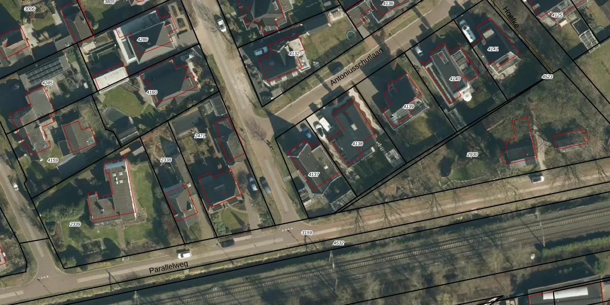 Het perceel waarop Antoniusschutlaan 2 staat heeft een oppervlakte van 445 m². Dit is een groot perceel. De perceeloppervlakte wordt geregistreerd door het Kadaster. Gedetailleerde informatie over de maten van dit perceel kunt u vinden in het rapport Kadastrale kaart met maatvoering van Antoniusschutlaan 2.