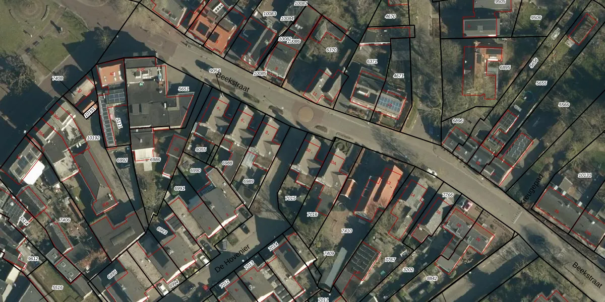 Beekstraat 10 is gelegen op kadastraal perceel NNN00E7015. Deze kadastrale aanduiding is uniek en wordt gebruikt door het Kadaster om eigendomsrechten en andere zakelijke rechten vast te leggen. Het perceel maakt onderdeel uit van de kadastrale gemeente Nuenen.
