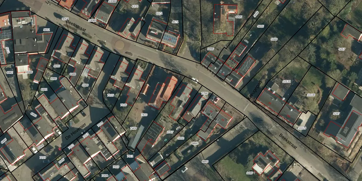 Beekstraat 14 is gelegen op kadastraal perceel NNN00E7767. Deze kadastrale aanduiding is uniek en wordt gebruikt door het Kadaster om eigendomsrechten en andere zakelijke rechten vast te leggen. Het perceel maakt onderdeel uit van de kadastrale gemeente Nuenen.