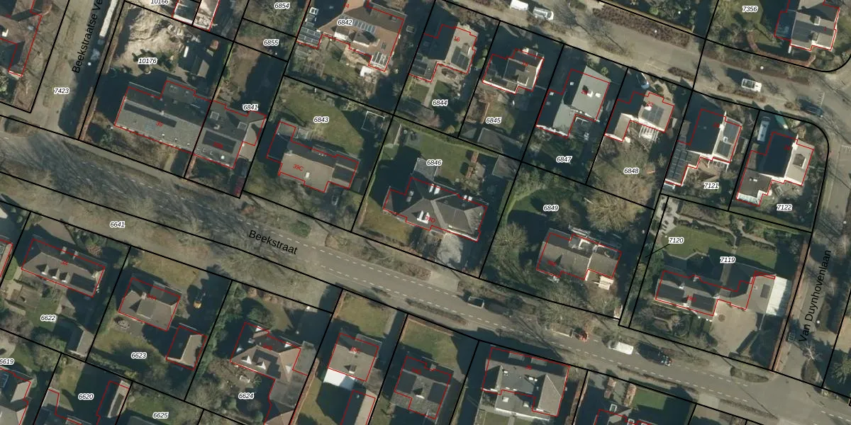 Het perceel waarop Beekstraat 39-D staat heeft een oppervlakte van 937 m². Dit is een groot perceel. De perceeloppervlakte wordt geregistreerd door het Kadaster. Gedetailleerde informatie over de maten van dit perceel kunt u vinden in het rapport Kadastrale kaart met maatvoering van Beekstraat 39-D.