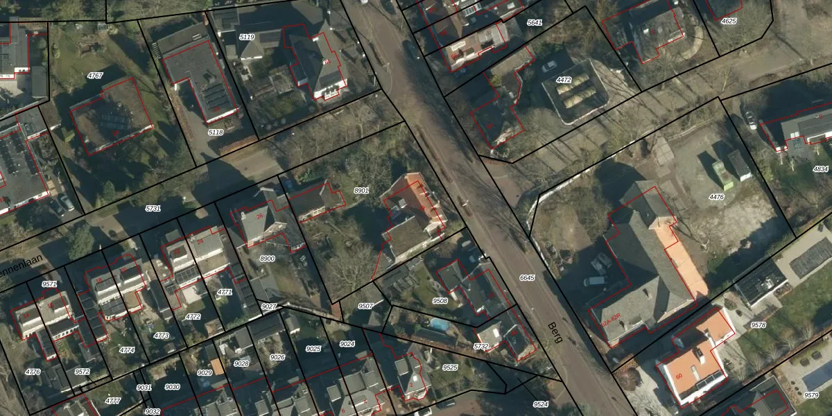 Het perceel waarop Berg 59 staat heeft een oppervlakte van 1118 m². Dit is een zeer groot perceel. De perceeloppervlakte wordt geregistreerd door het Kadaster. Gedetailleerde informatie over de maten van dit perceel kunt u vinden in het rapport Kadastrale kaart met maatvoering van Berg 59.