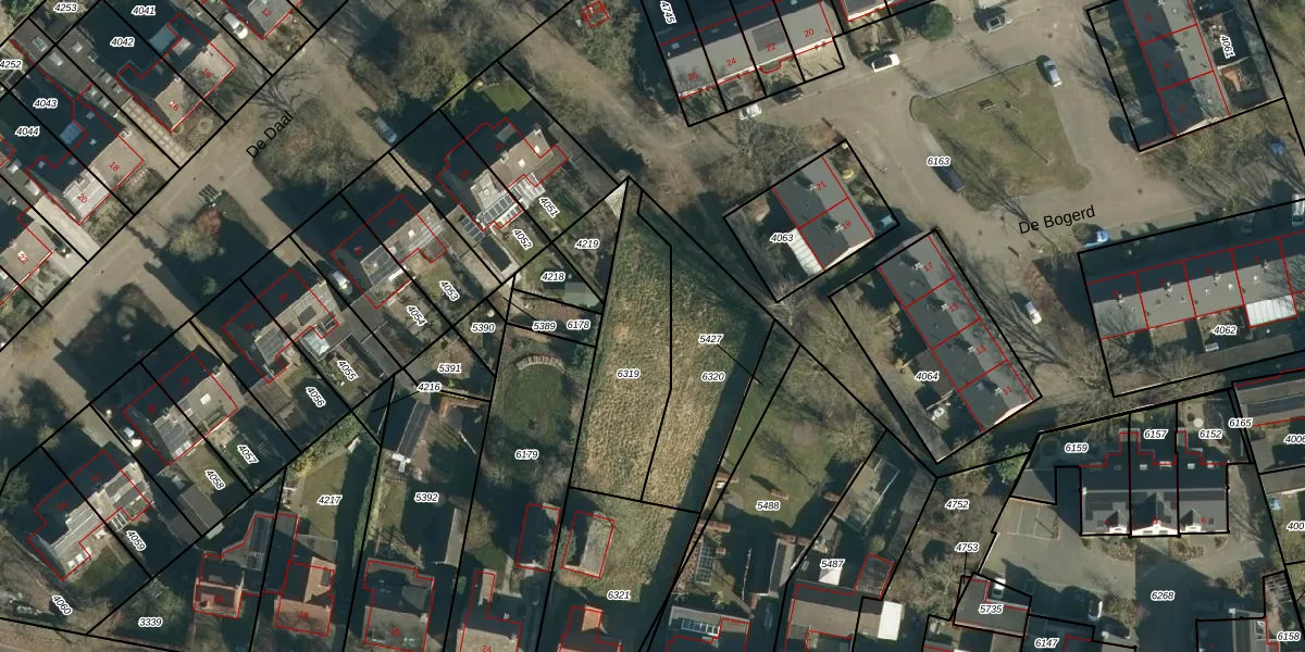 Het perceel waarop De Bogerd 25 staat heeft een oppervlakte van 466 m². Dit is een groot perceel. De perceeloppervlakte wordt geregistreerd door het Kadaster. Gedetailleerde informatie over de maten van dit perceel kunt u vinden in het rapport Kadastrale kaart met maatvoering van De Bogerd 25.