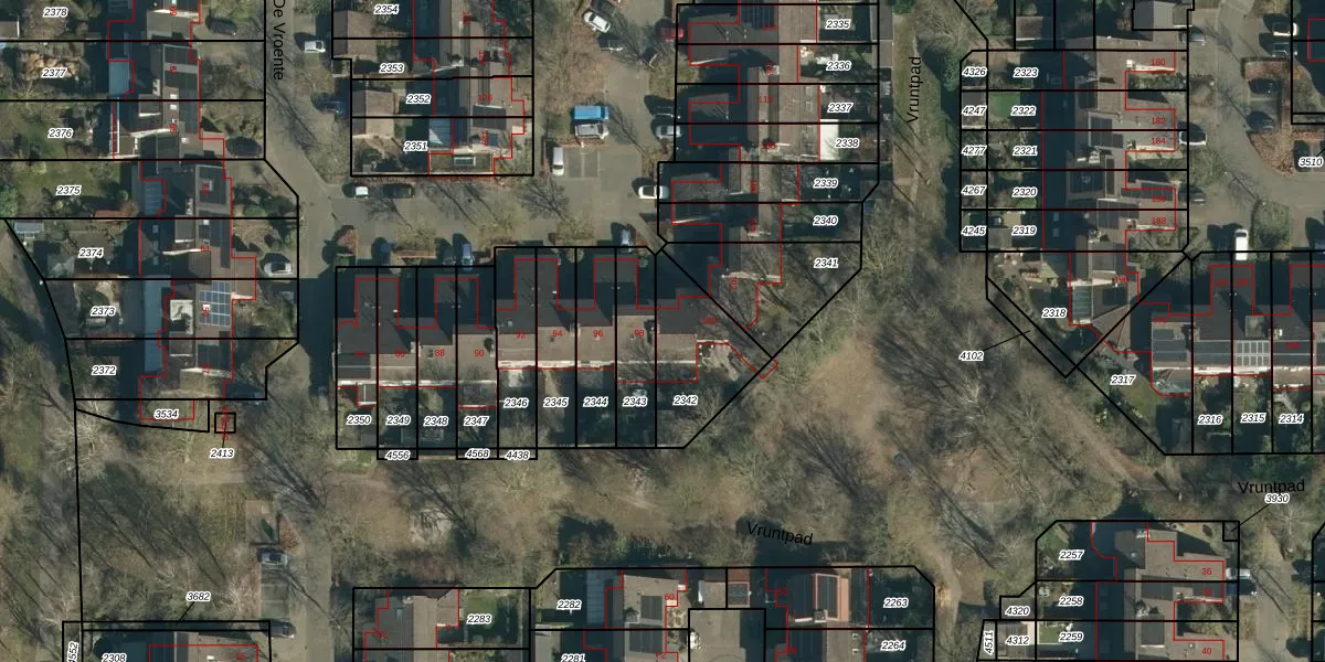 Het perceel waarop De Vroente 100 staat heeft een oppervlakte van 296 m². Dit is een middelgroot perceel. De perceeloppervlakte wordt geregistreerd door het Kadaster. Gedetailleerde informatie over de maten van dit perceel kunt u vinden in het rapport Kadastrale kaart met maatvoering van De Vroente 100.