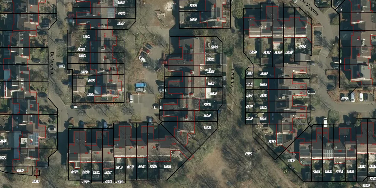 Het perceel waarop De Vroente 108 staat heeft een oppervlakte van 184 m². Dit is een middelgroot perceel. De perceeloppervlakte wordt geregistreerd door het Kadaster. Gedetailleerde informatie over de maten van dit perceel kunt u vinden in het rapport Kadastrale kaart met maatvoering van De Vroente 108.