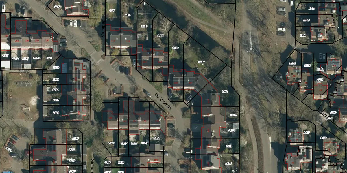 Het perceel waarop De Vroente 125 staat heeft een oppervlakte van 393 m². Dit is een groot perceel. De perceeloppervlakte wordt geregistreerd door het Kadaster. Gedetailleerde informatie over de maten van dit perceel kunt u vinden in het rapport Kadastrale kaart met maatvoering van De Vroente 125.