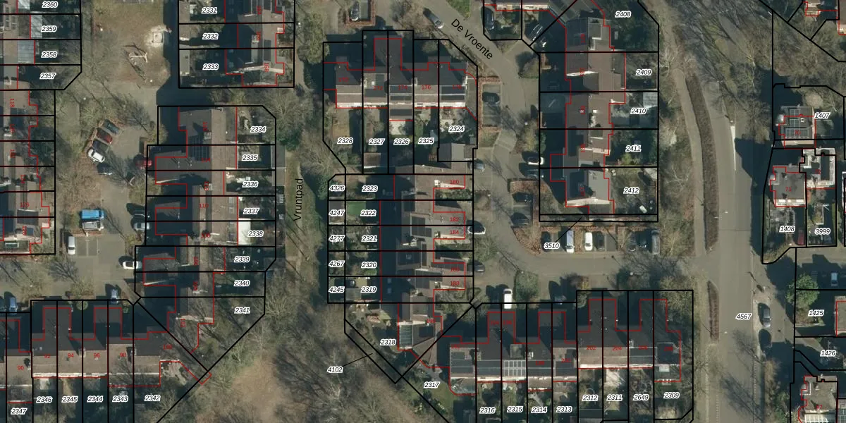 Het perceel waarop De Vroente 182 staat heeft een oppervlakte van 182 m². Dit is een middelgroot perceel. De perceeloppervlakte wordt geregistreerd door het Kadaster. Gedetailleerde informatie over de maten van dit perceel kunt u vinden in het rapport Kadastrale kaart met maatvoering van De Vroente 182.