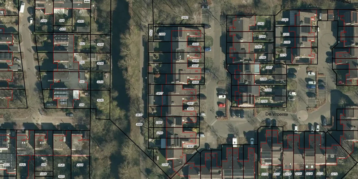 De Vroente 45 is gelegen op kadastraal perceel NNN00F3877. Deze kadastrale aanduiding is uniek en wordt gebruikt door het Kadaster om eigendomsrechten en andere zakelijke rechten vast te leggen. Het perceel maakt onderdeel uit van de kadastrale gemeente Nuenen.