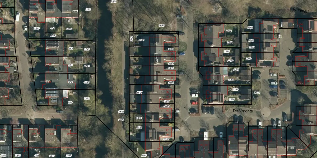Het perceel waarop De Vroente 47 staat heeft een oppervlakte van 188 m². Dit is een middelgroot perceel. De perceeloppervlakte wordt geregistreerd door het Kadaster. Gedetailleerde informatie over de maten van dit perceel kunt u vinden in het rapport Kadastrale kaart met maatvoering van De Vroente 47.