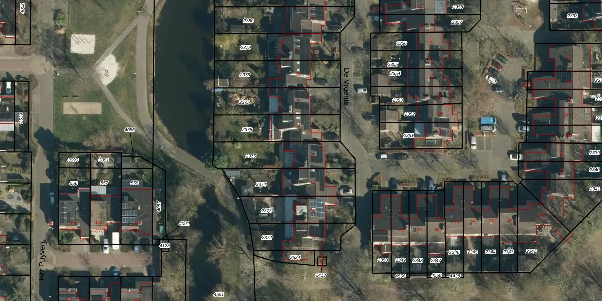Het perceel waarop De Vroente 63 staat heeft een oppervlakte van 410 m². Dit is een groot perceel. De perceeloppervlakte wordt geregistreerd door het Kadaster. Gedetailleerde informatie over de maten van dit perceel kunt u vinden in het rapport Kadastrale kaart met maatvoering van De Vroente 63.
