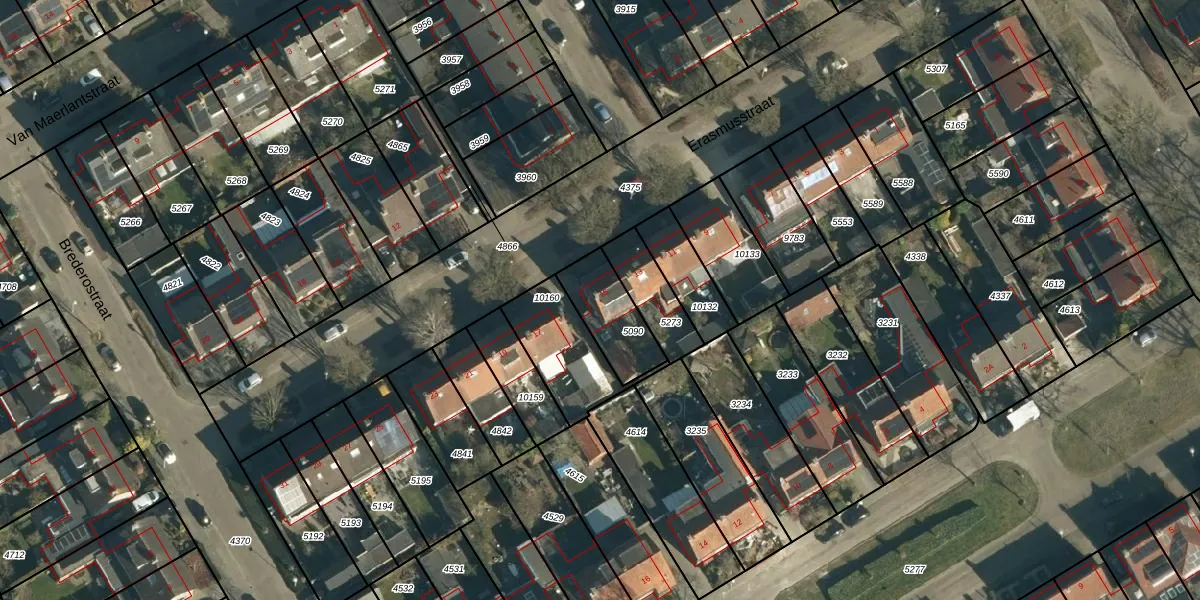 Het perceel waarop Erasmusstraat 15 staat heeft een oppervlakte van 193 m². Dit is een middelgroot perceel. De perceeloppervlakte wordt geregistreerd door het Kadaster. Gedetailleerde informatie over de maten van dit perceel kunt u vinden in het rapport Kadastrale kaart met maatvoering van Erasmusstraat 15.