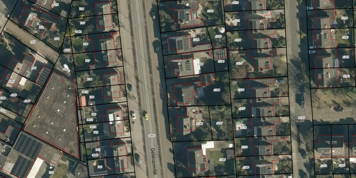 Het perceel waarop Geldropsedijk 9-A staat heeft een oppervlakte van 625 m². Dit is een groot perceel. De perceeloppervlakte wordt geregistreerd door het Kadaster. Gedetailleerde informatie over de maten van dit perceel kunt u vinden in het rapport Kadastrale kaart met maatvoering van Geldropsedijk 9-A.