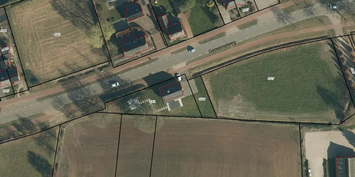Het perceel waarop Gerwenseweg 8 staat heeft een oppervlakte van 955 m². Dit is een groot perceel. De perceeloppervlakte wordt geregistreerd door het Kadaster. Gedetailleerde informatie over de maten van dit perceel kunt u vinden in het rapport Kadastrale kaart met maatvoering van Gerwenseweg 8.