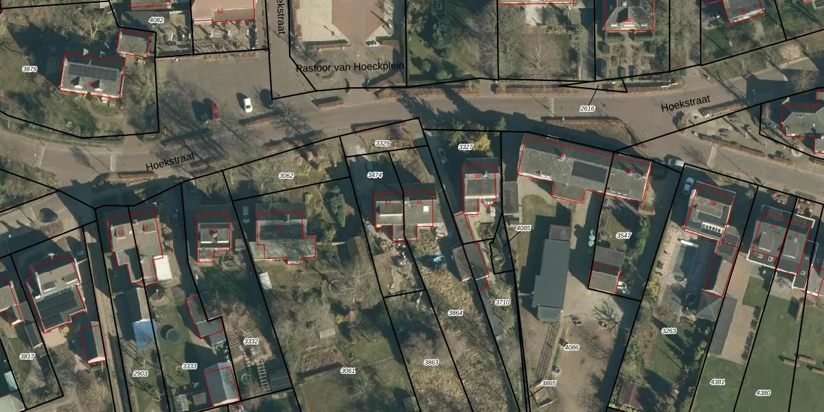 Hoekstraat 41 is gelegen op kadastraal perceel NNN00A3864. Deze kadastrale aanduiding is uniek en wordt gebruikt door het Kadaster om eigendomsrechten en andere zakelijke rechten vast te leggen. Het perceel maakt onderdeel uit van de kadastrale gemeente Nuenen.