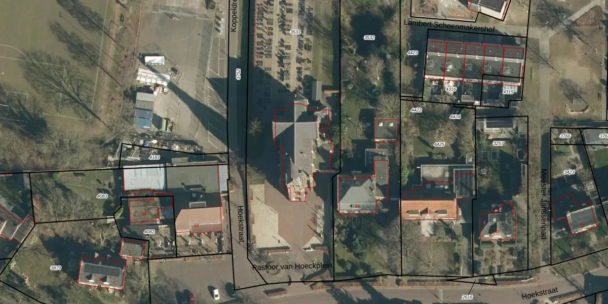 Hoekstraat 46 is gelegen op kadastraal perceel NNN00A3533. Deze kadastrale aanduiding is uniek en wordt gebruikt door het Kadaster om eigendomsrechten en andere zakelijke rechten vast te leggen. Het perceel maakt onderdeel uit van de kadastrale gemeente Nuenen.