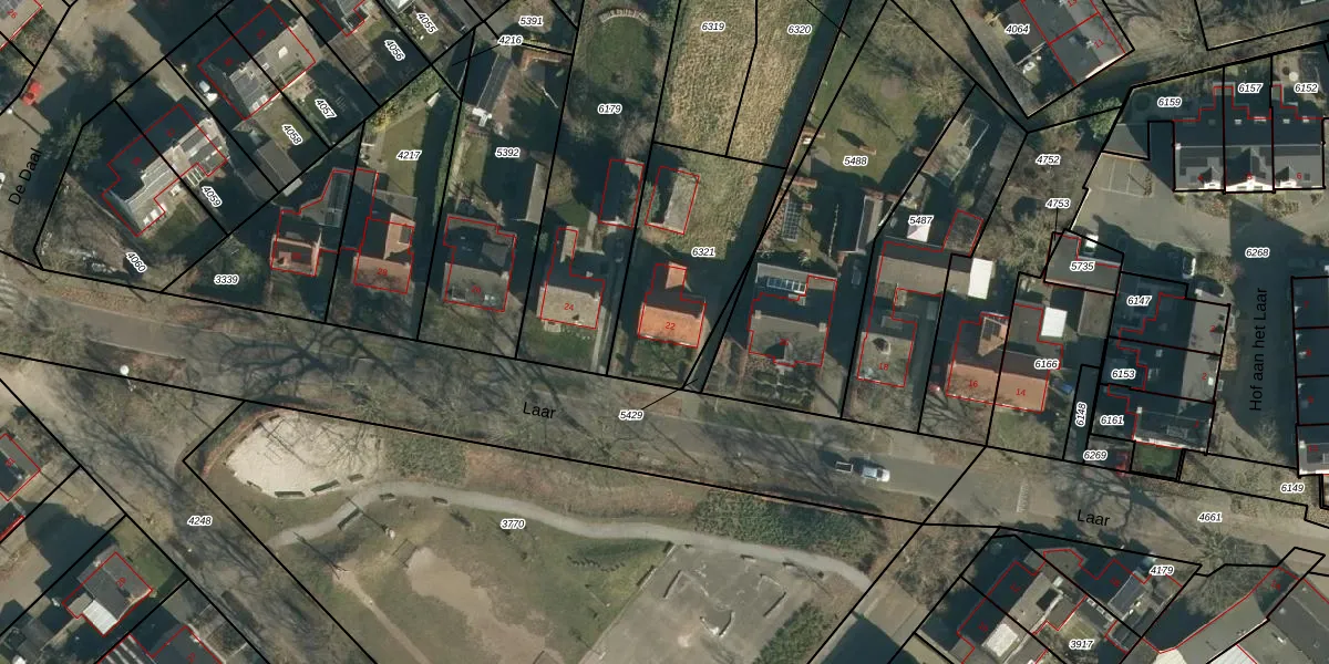 Het perceel waarop Laar 22 staat heeft een oppervlakte van 593 m². Dit is een groot perceel. De perceeloppervlakte wordt geregistreerd door het Kadaster. Gedetailleerde informatie over de maten van dit perceel kunt u vinden in het rapport Kadastrale kaart met maatvoering van Laar 22.