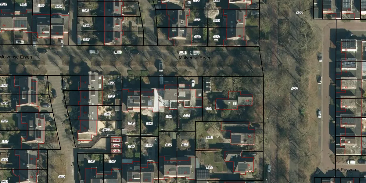 Molvense Erven 1 is gelegen op kadastraal perceel NNN00F3101. Deze kadastrale aanduiding is uniek en wordt gebruikt door het Kadaster om eigendomsrechten en andere zakelijke rechten vast te leggen. Het perceel maakt onderdeel uit van de kadastrale gemeente Nuenen.