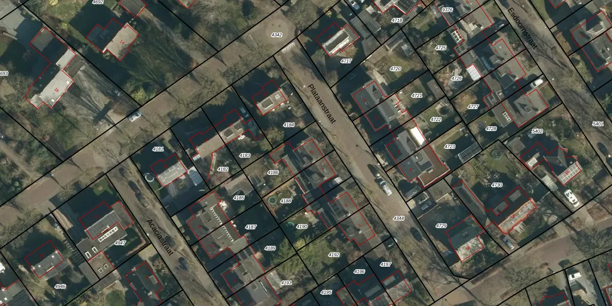 Plataanstraat 9 is gelegen op kadastraal perceel NNN00E4186. Deze kadastrale aanduiding is uniek en wordt gebruikt door het Kadaster om eigendomsrechten en andere zakelijke rechten vast te leggen. Het perceel maakt onderdeel uit van de kadastrale gemeente Nuenen.