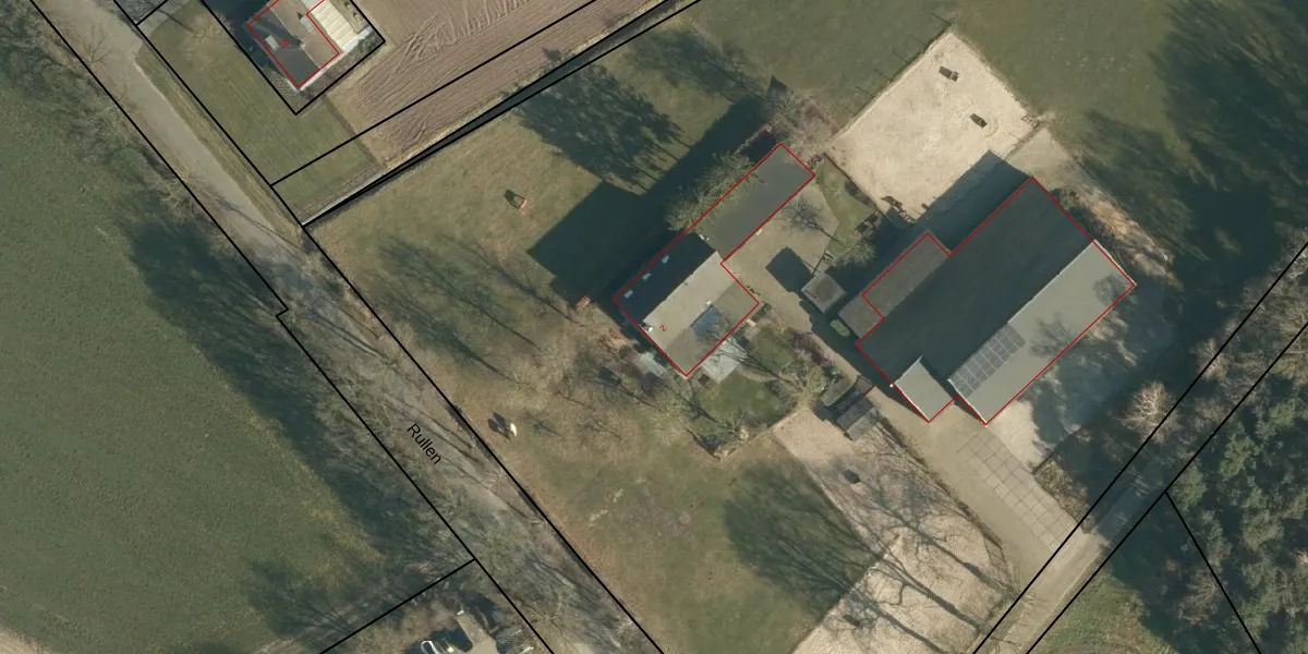 Het perceel waarop Rullen 2 staat heeft een oppervlakte van 2,0 ha. Dit is een zeer groot perceel. De perceeloppervlakte wordt geregistreerd door het Kadaster. Gedetailleerde informatie over de maten van dit perceel kunt u vinden in het rapport Kadastrale kaart met maatvoering van Rullen 2.