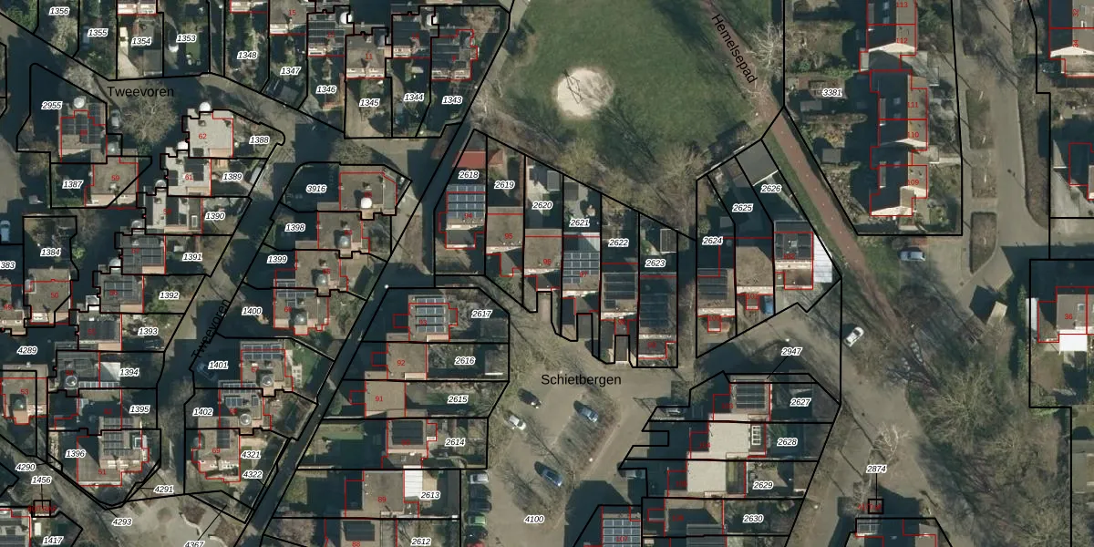 Het perceel waarop Schietbergen 96 staat heeft een oppervlakte van 180 m². Dit is een middelgroot perceel. De perceeloppervlakte wordt geregistreerd door het Kadaster. Gedetailleerde informatie over de maten van dit perceel kunt u vinden in het rapport Kadastrale kaart met maatvoering van Schietbergen 96.