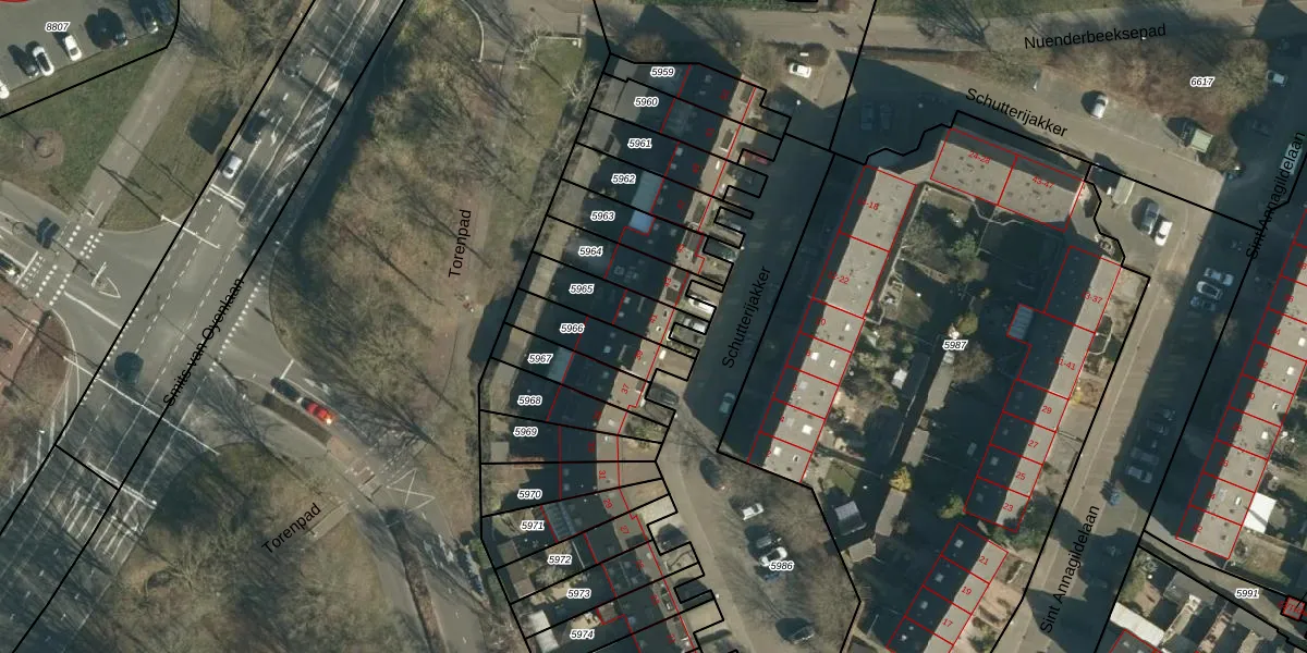 Schutterijakker 41 is gelegen op kadastraal perceel NNN00E5965. Deze kadastrale aanduiding is uniek en wordt gebruikt door het Kadaster om eigendomsrechten en andere zakelijke rechten vast te leggen. Het perceel maakt onderdeel uit van de kadastrale gemeente Nuenen.