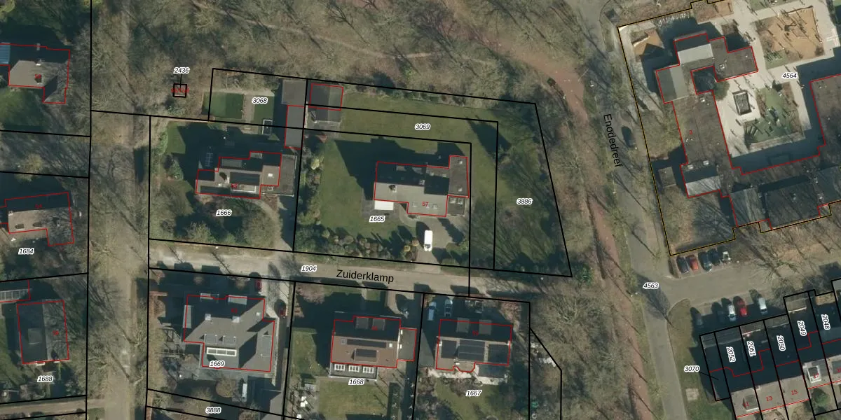 Het perceel waarop Zuiderklamp 57 staat heeft een oppervlakte van 1210 m². Dit is een zeer groot perceel. De perceeloppervlakte wordt geregistreerd door het Kadaster. Gedetailleerde informatie over de maten van dit perceel kunt u vinden in het rapport Kadastrale kaart met maatvoering van Zuiderklamp 57.