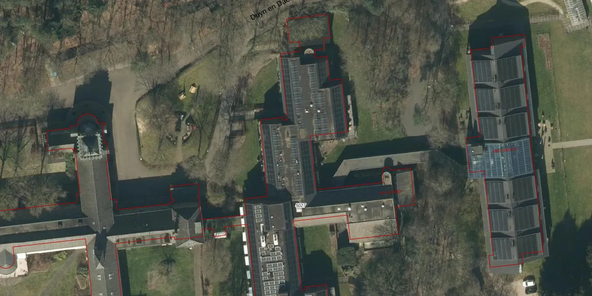 Het perceel waarop Duyn en Daelseweg 15-A-418 staat heeft een oppervlakte van 6,1 ha. Dit is een zeer groot perceel. De perceeloppervlakte wordt geregistreerd door het Kadaster. Gedetailleerde informatie over de maten van dit perceel kunt u vinden in het rapport Kadastrale kaart met maatvoering van Duyn en Daelseweg 15-A-418.